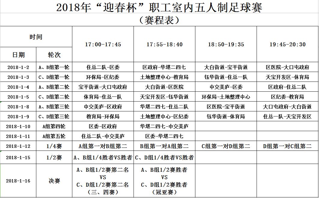 由宝坻区总工会、宝坻区体育局、宝坻区农民体协主办的2018年“迎春杯”职工室内五人制足球赛于2018年1月2日在宝坻区体育中心主场馆进行,来自区机关单位、企事业单位以及各街道共17支职工足球队参加。